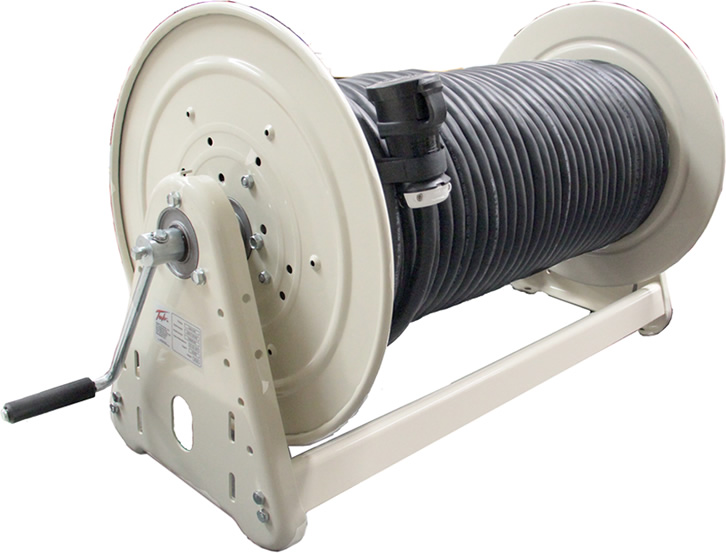 The Tesla™ Reel is designed for rugged heavy duty uses requiring long lengths of line cords and large storage capacity. The full flow swivel and heavy gauge frame gives maximum strength and consistent quality. The examples pictured are holding a 100 meter (328 ft.) 8/3 cable.