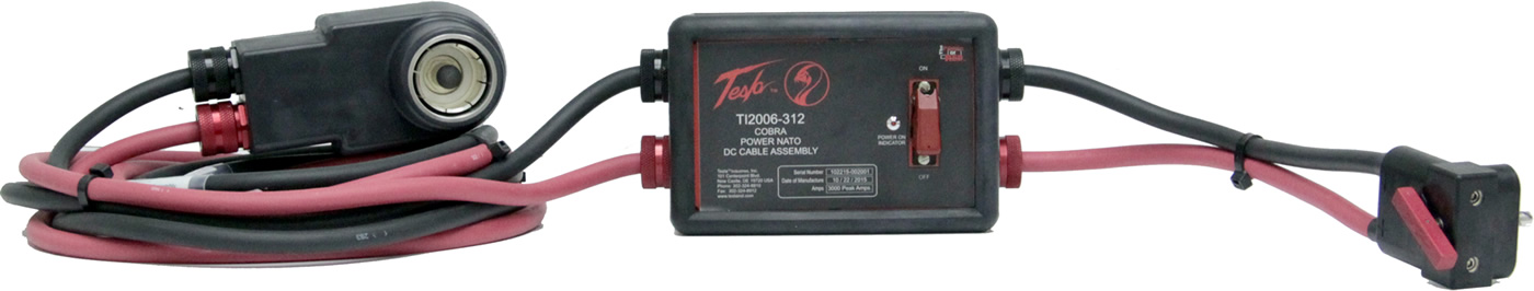 The Tesla™ Cobra Power NATO DC Cable Assembly is equipped with a high current switchable control. A hermetically sealed toggle switch, along with a protective switch guard, allows the safe transfer of up to 3000 peak amps — no more arcing or fusing. When active, a status LED illuminates to let the user know power is present.