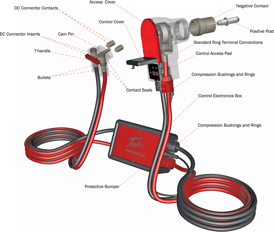 Unlike slave cables, that are molded directly into the plug housing, easily accessible lugs allow for direct termination inside of the plug. Additionally, compression grommets and bushings provide strain relief. This unique combination of protection eliminates potential shocks from exposed wiring due to cable stretching and splicing.