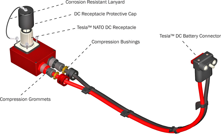 The Tesla™ NATO DC Receptacle includes a durable cap tethered with a corrosion resistant lanyard. The cap, along with the cap seal at the base of the receptacle, protect the receptacle from rain, snow, sand and other harmful debris.