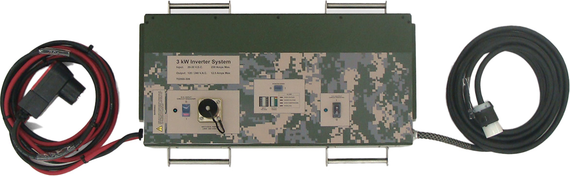 A Tesla™ Power Inverter System is an advanced piece of equipment and an ideal method of converting 20-30 dc voltage to pure usable 120/240 ac voltage. The TI2000-308 is a Pure Sine Wave Inverter System. This system can be used in a tactical or non-tactical environment giving the user the needed flexibility to operate ac components (with approved connectors) like laptop computers, test measurement and diagnostic equipment, additional lighting, or any other item that requires ac voltage. This unit is man-portable, maintenance free, and can be operated from any 20-30 dc voltage power sources. Designed for military applications it is easily transported and is invaluable for times when ac power is required in a field environment.