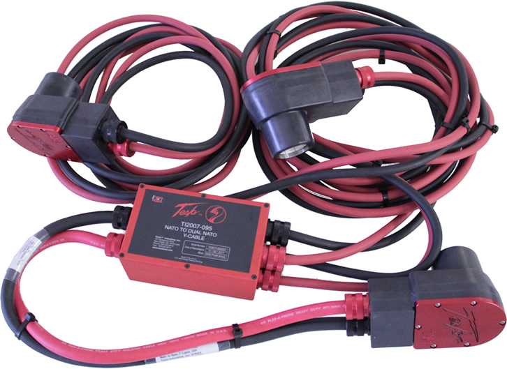 Y-Cable Assembly has an NATO Connector with a 3ft. 4Ø cable to a sealed connection box branching out to Dual NATO Connectors with 20 ft. 1Ø cables.
